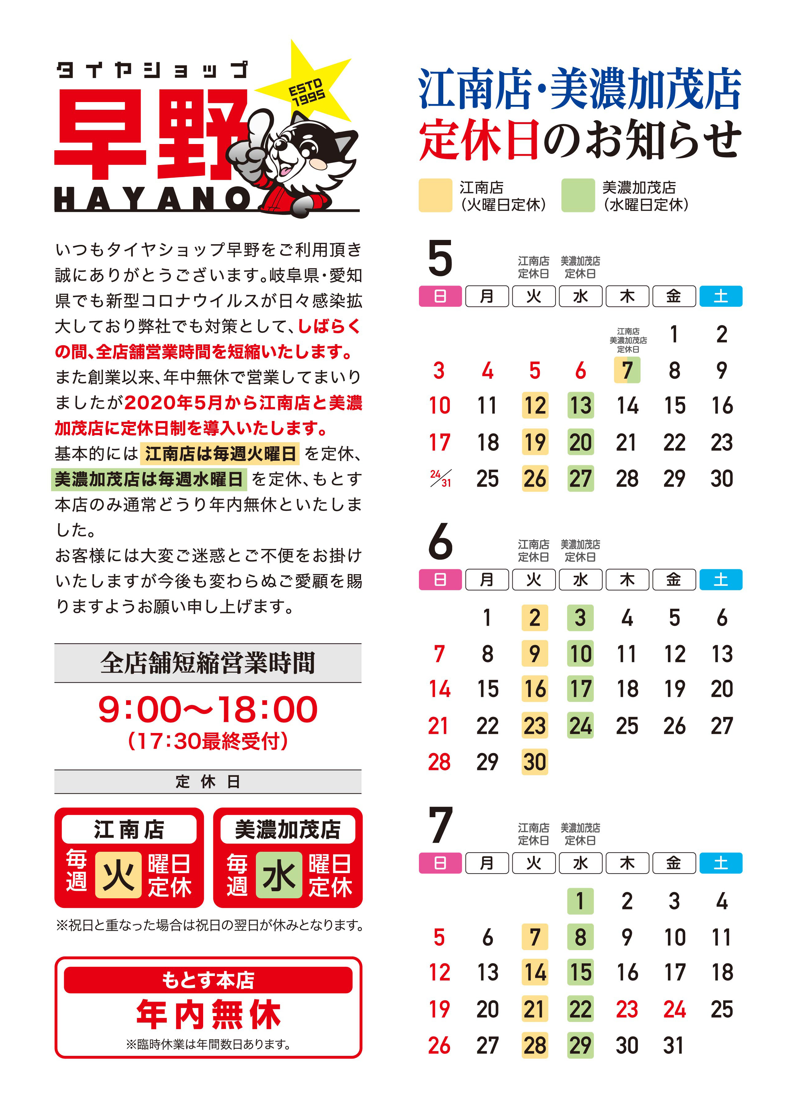 創業以来、年中無休で営業してまいりましたが昨今の岐阜県・愛知県でも新型コロナウイルスが日々感染拡大しており弊社でも対策として 2020年5月より江南店と美濃加茂店に定休日制を導入致します。