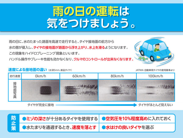 タイヤと路面の間に水が入り込み、タイヤが路面に接触しなくなることで、車が水の上を滑り、ブレーキやハンドル操作がきかなくなり、スリップやスピンなどを起こす危険性が高くなります。