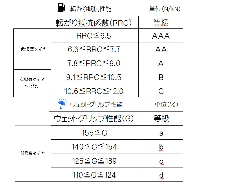 ※転がり抵抗係数が12.1以上、「ウェットグリップ性能」が110以下のタイヤは、「ラベリング制度」の対象外です。