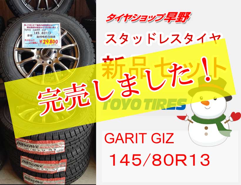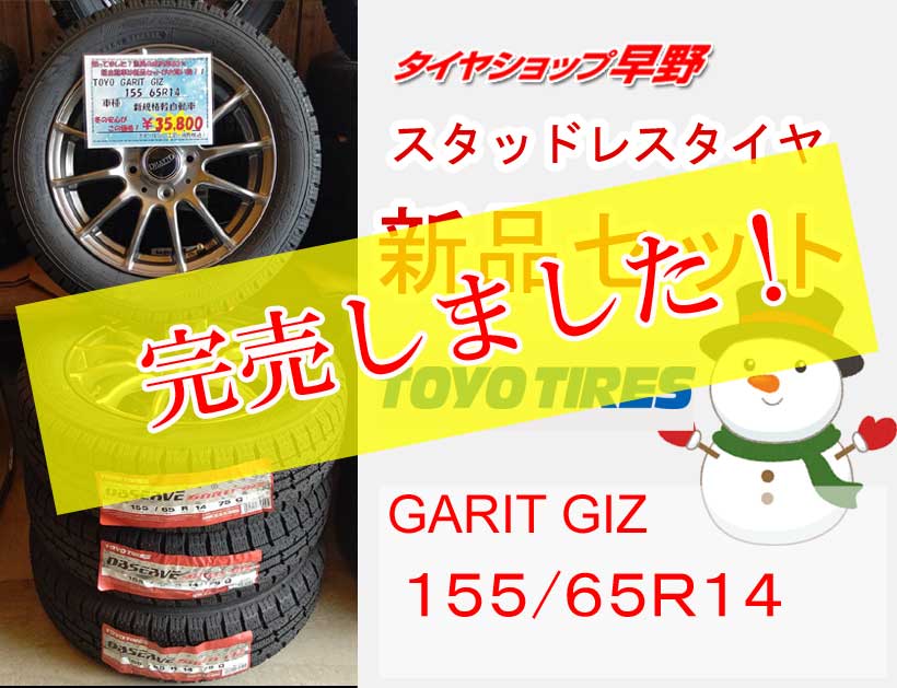 新品タイヤの今年のイチオシはTOYOのGARIT GIZとDUNLOPのWINTER MAXX SV01になっています。また、ホイールセット品が特にオススメです!詳しい情報は店頭にてご相談くださいませ!