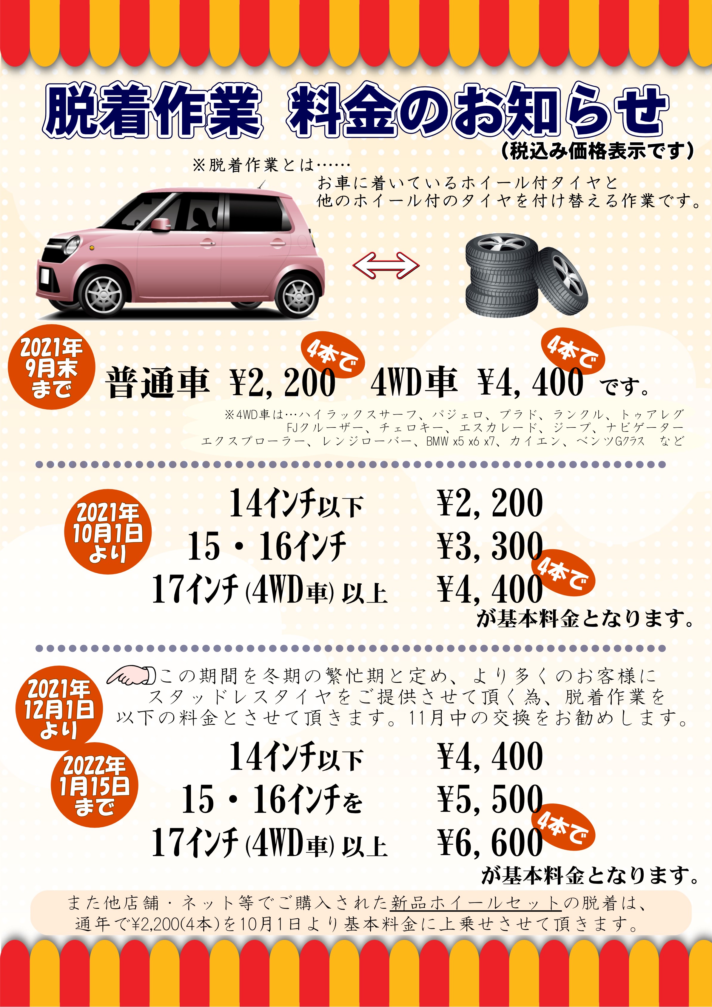 価格変更のお知らせ(2021年10月~) 2021.02.09 お知らせ 2021年10月1日より、脱着作業の金額が変わります!下記よりご確認ください!! ↓ ↓ ↓ ↓ ↓ ↓ ↓ ↓ ↓ ↓ ↓ ↓ ↓ ↓ ↓ ↓ ※冬期・条件によって更に価格が変更となりますので、ご注意ください!!