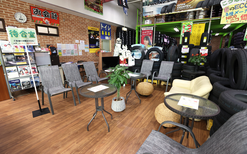2010年に愛知県にOPENしてから、江南店も他店舗と同様、アットホームなタイヤ屋さんを目指しています。待ち時間にドリンクを飲んで頂けるスペースも設けております。